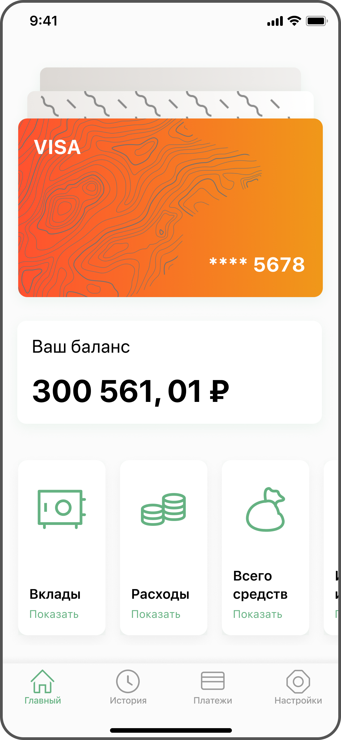 Piggy Bank is a mobile banking offering. This interface combines the ability to view the amount of money in the account, transfers, receive money from other users and view the history of payments.